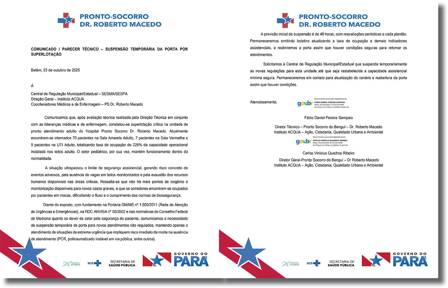 m documento divulgado sexta-feira, 3, a direção do Hospital Pronto Socorro Dr. Roberto Macêdo, localizado no bairro do Bengui, em Belém, comunica a suspensão das atividades, motivada por ‘superlotação crítica’ na unidade de pronto atendimento de adultos.