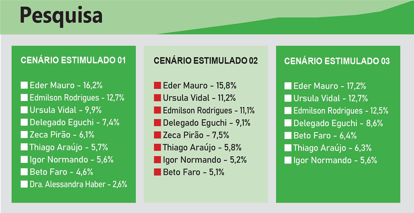 ivulgada na última quinta-feira, a nova pesquisa Mentor Inteligência sobre as eleições para a Prefeitura de Belém 2024 revela um cenário de incertezas. Entrevistando 800 eleitores em todos os distritos da capital, a coleta mostra um avanço, em vias de consolidação, do campo da direita-extrema direita, que se identifica com o nome do deputado Éder Mauro, postado confortavelmente na dianteira em todos os cenários.
