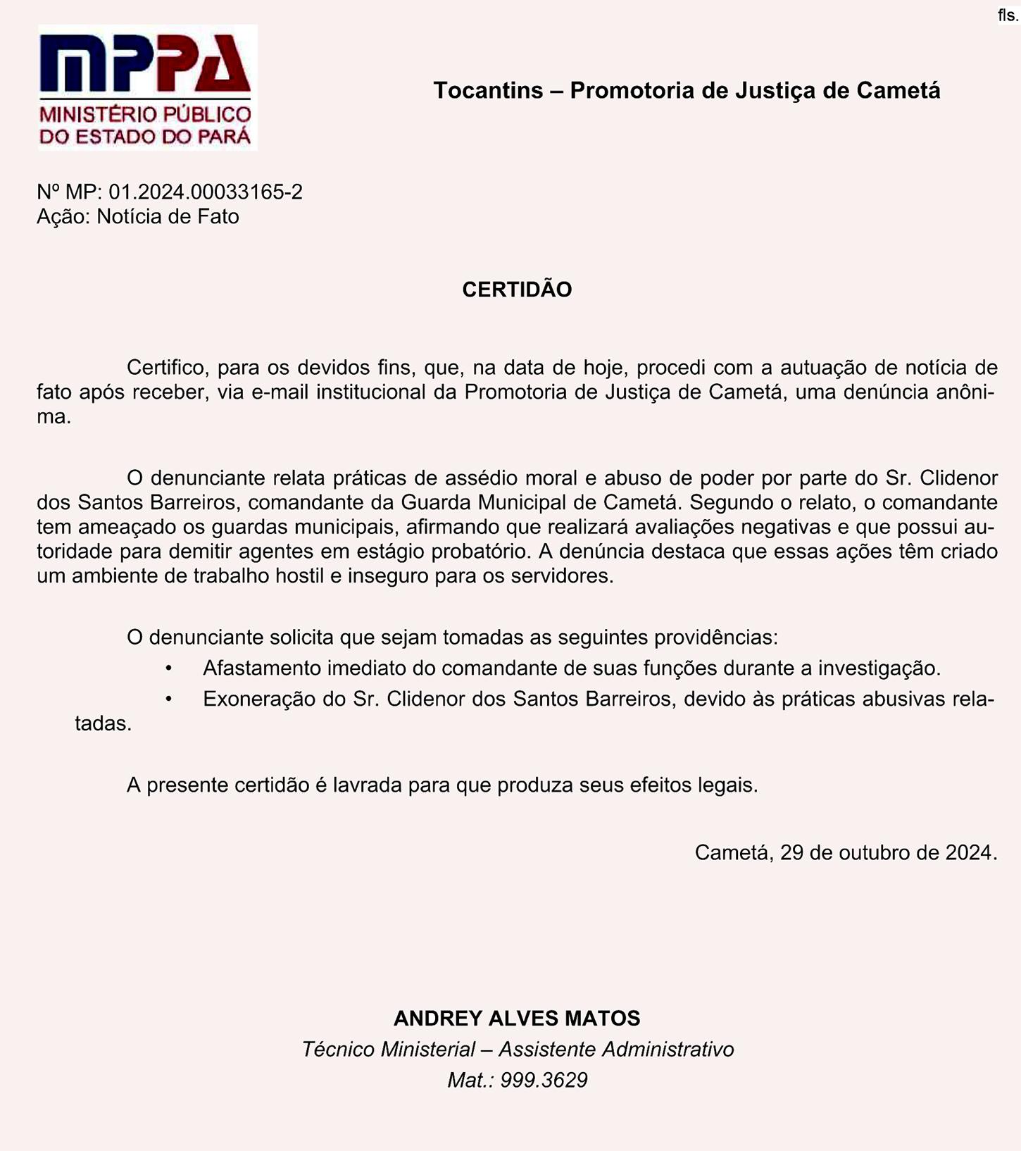 A maioria dos guardas vem sofrendo perseguição. O agente Mizael Belém pediu exoneração do cargo por não aguentar a perseguição; o guarda Furtado sofre a mesma perseguição do comandante”, relata Jeremias. Os fatos constam de Boletim de Ocorrência registrado pelo agente na Delegacia de Polícia de Cametá, na tentativa de resguardar seus direitos.
