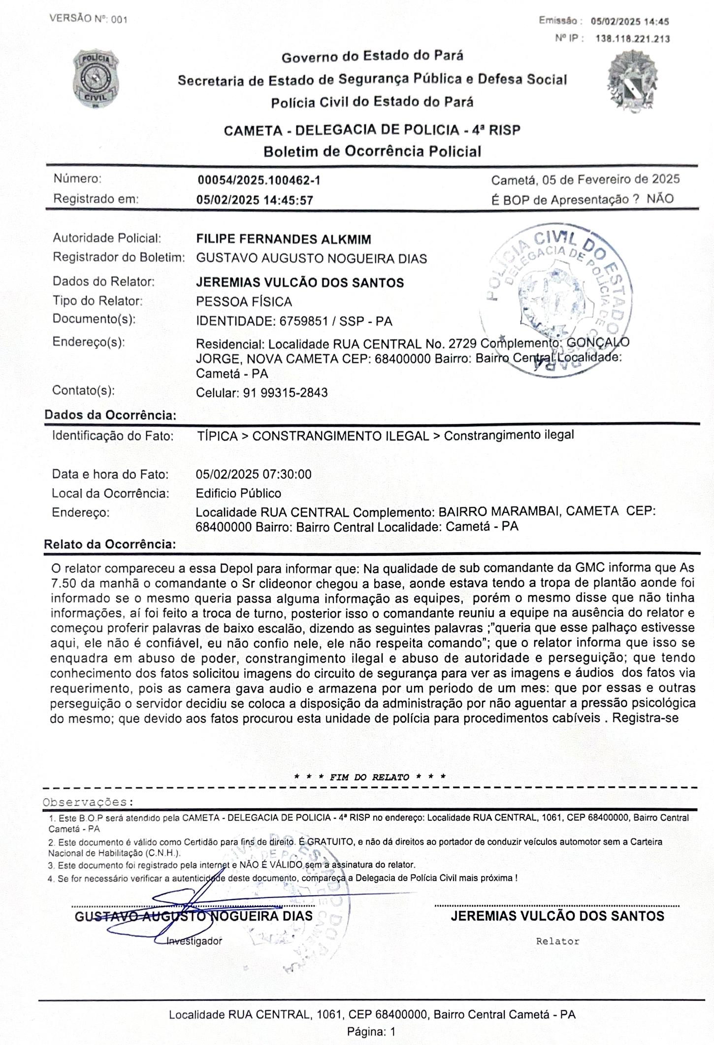 Jeremias acentua que esse tipo de conversa, na ausência dele, se enquadra em abuso de poder, constrangimento ilegal, abuso de autoridade e perseguição. Ele solicitou imagens do circuito de segurança para ver as imagens, via requerimento. Depois desse incidente, o servidor decidiu se colocar à disposição da administração, por não aguentar a pressão do comandante e decidiu procurar a Polícia para os procedimentos cabíveis.