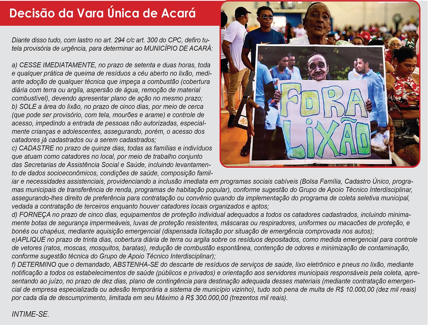 Na decisão, solenemente ignorada, a Justiça deu prazo de 72 horas para que a prefeitura encerrasse toda e qualquer prática de queima de resíduos a céu aberto no lixão localizado às margens da PA-252, no trecho entre Acará e Moju, após a constatação de risco iminente à saúde pública e ao meio ambiente decorrente da disposição irregular de lixo, inclusive hospitalar, diretamente sobre o solo natural.