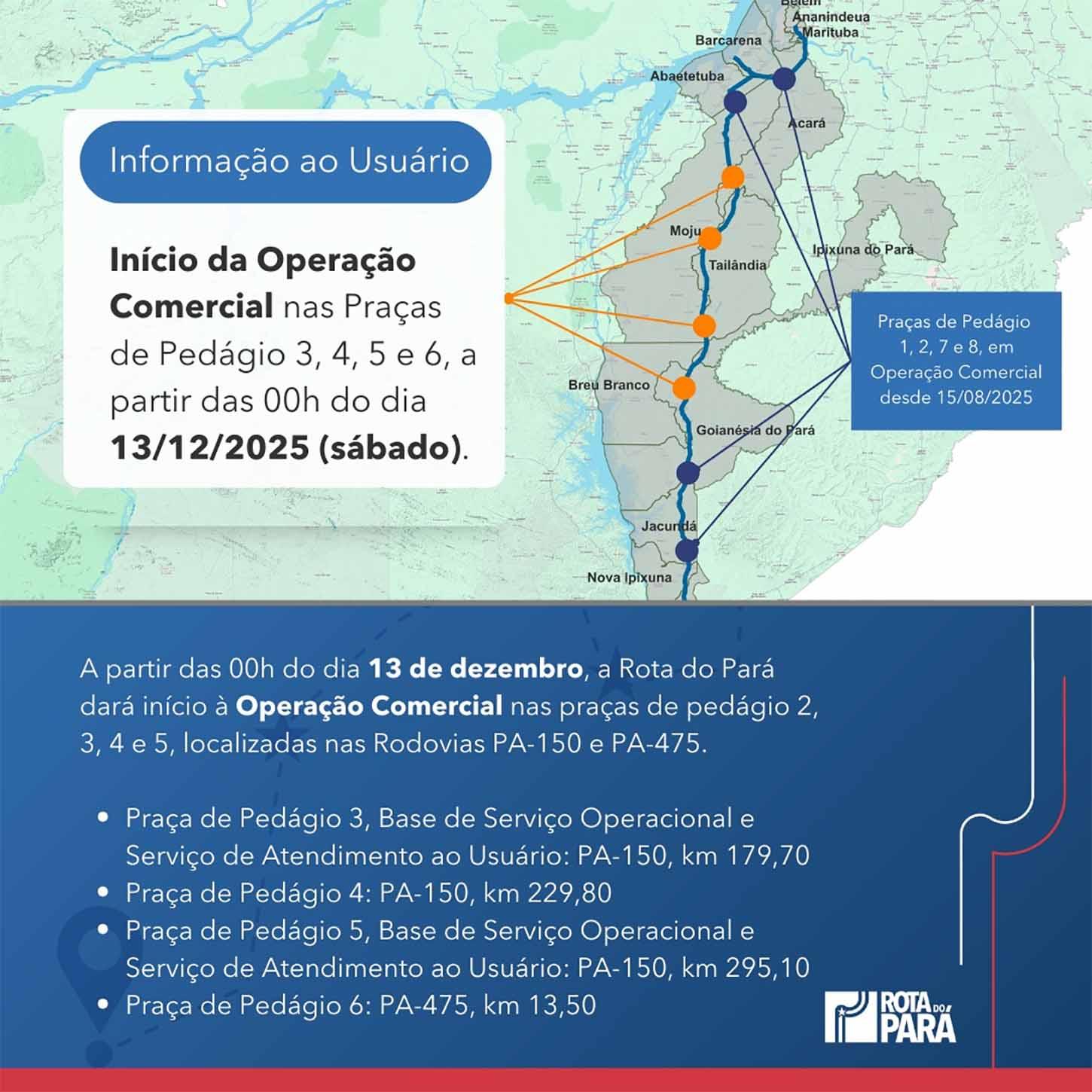 Rota do Pará, concessionária responsável pela administração das rodovias que interligam a Região Metropolitana de Belém a Morada Nova, em Marabá, no sudeste do Estado, iniciou, na madrugada de hoje, a cobrança de pedágio nas praças 3, 4, 5 e 6 com valor base de R$ 12. A cobrança ocorre na extensão da PA-150 e da PA-475 e entrou em vigor mesmo com muita reclamação de motoristas.
