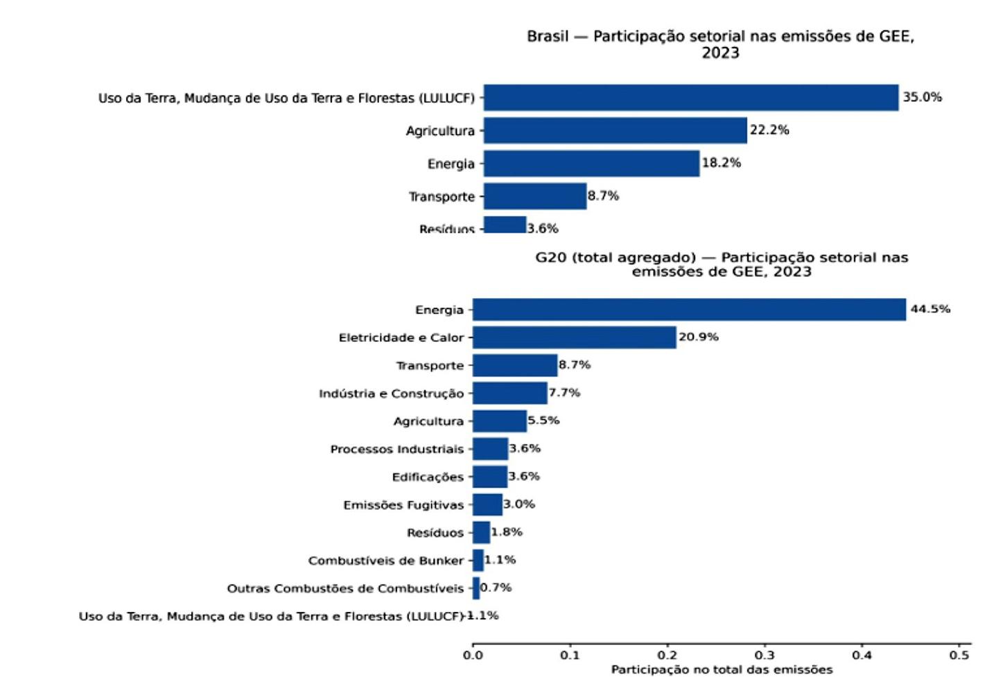 O dado chama atenção porque, no Brasil, a maior parcela das emissões de gases de efeito estufa está associada à agropecuária e à mudança do uso da terra - e não principalmente à energia ou ao transporte, como ocorre em muitas economias industrializadas. As evidências podem ser vistas no gráfico abaixo: