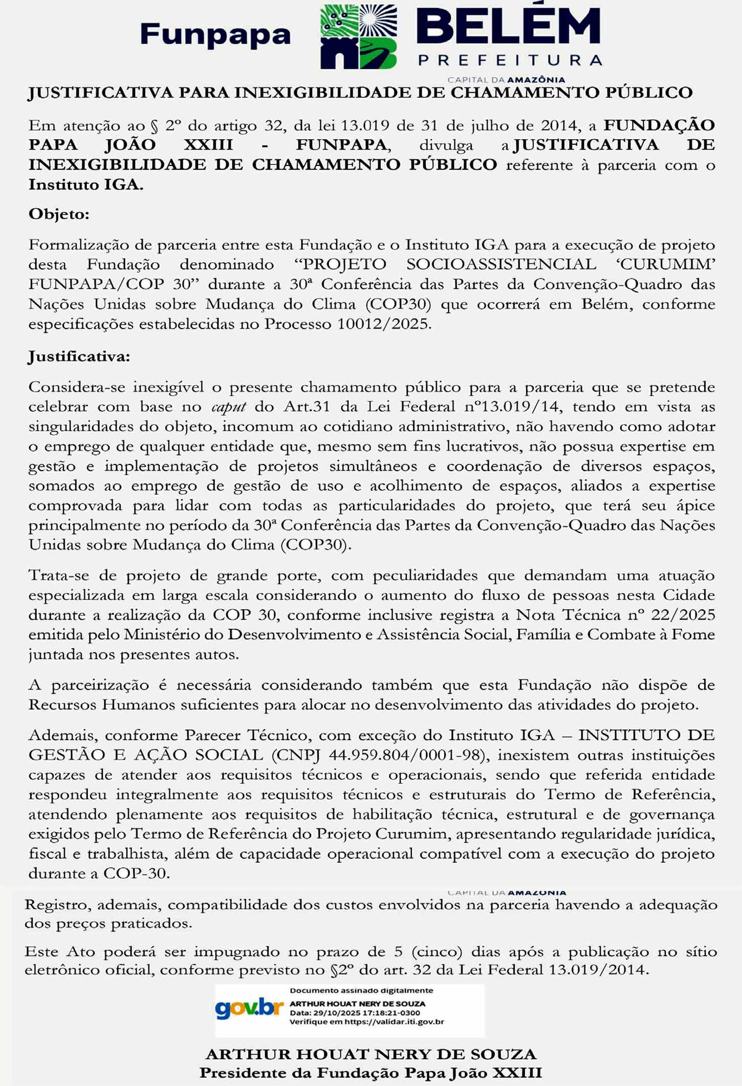 Mais adiante, a Fundação publicou justificativa de inexigibilidade de chamamento público, sustentando que o projeto tinha “objeto singular” e que, “com exceção do Instituto Iga”, não haveria outras organizações aptas a executá-lo.